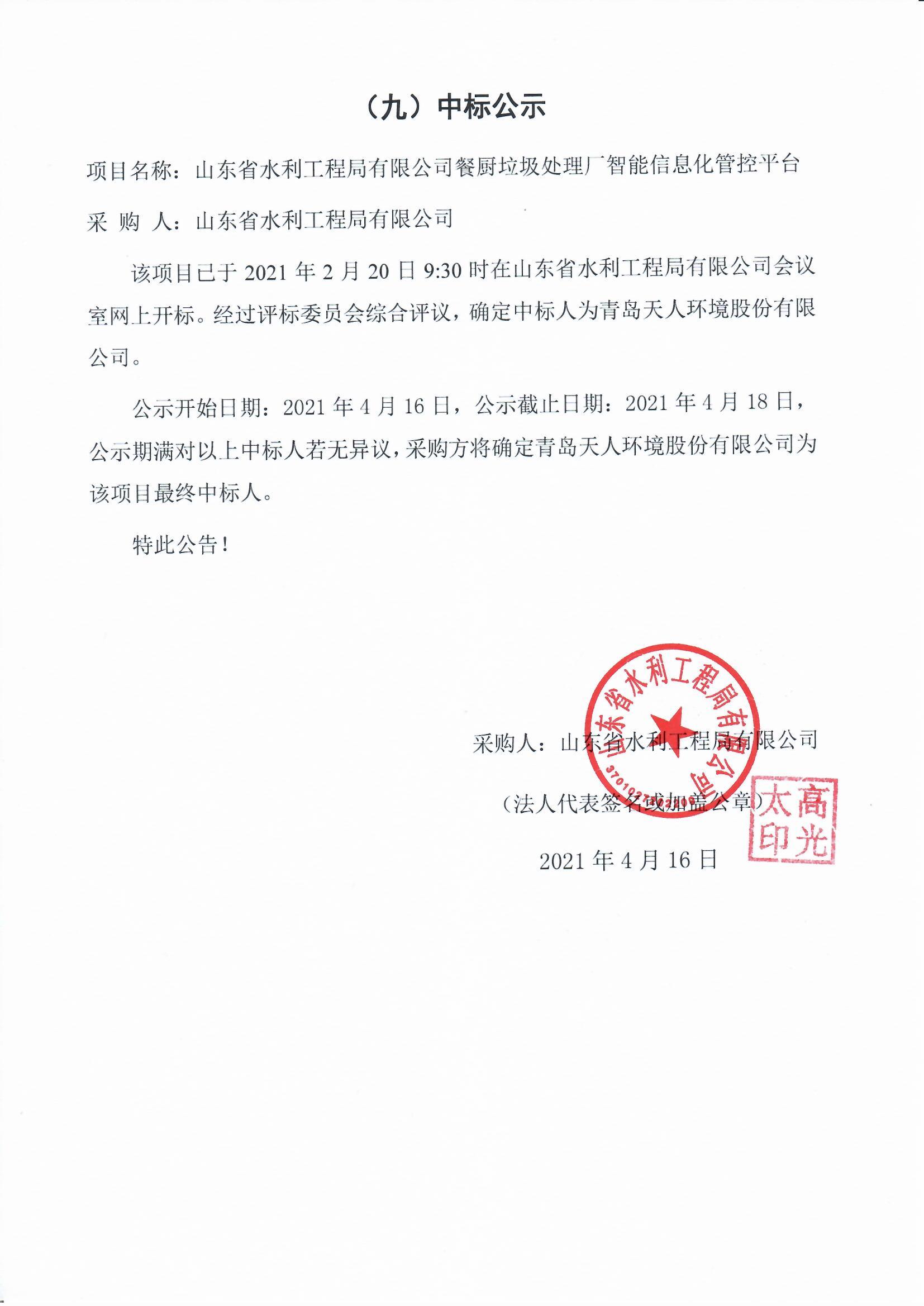 山東省水利工程局有限公司餐廚垃圾處理廠智能信息化管控平臺(tái)中標(biāo)公示