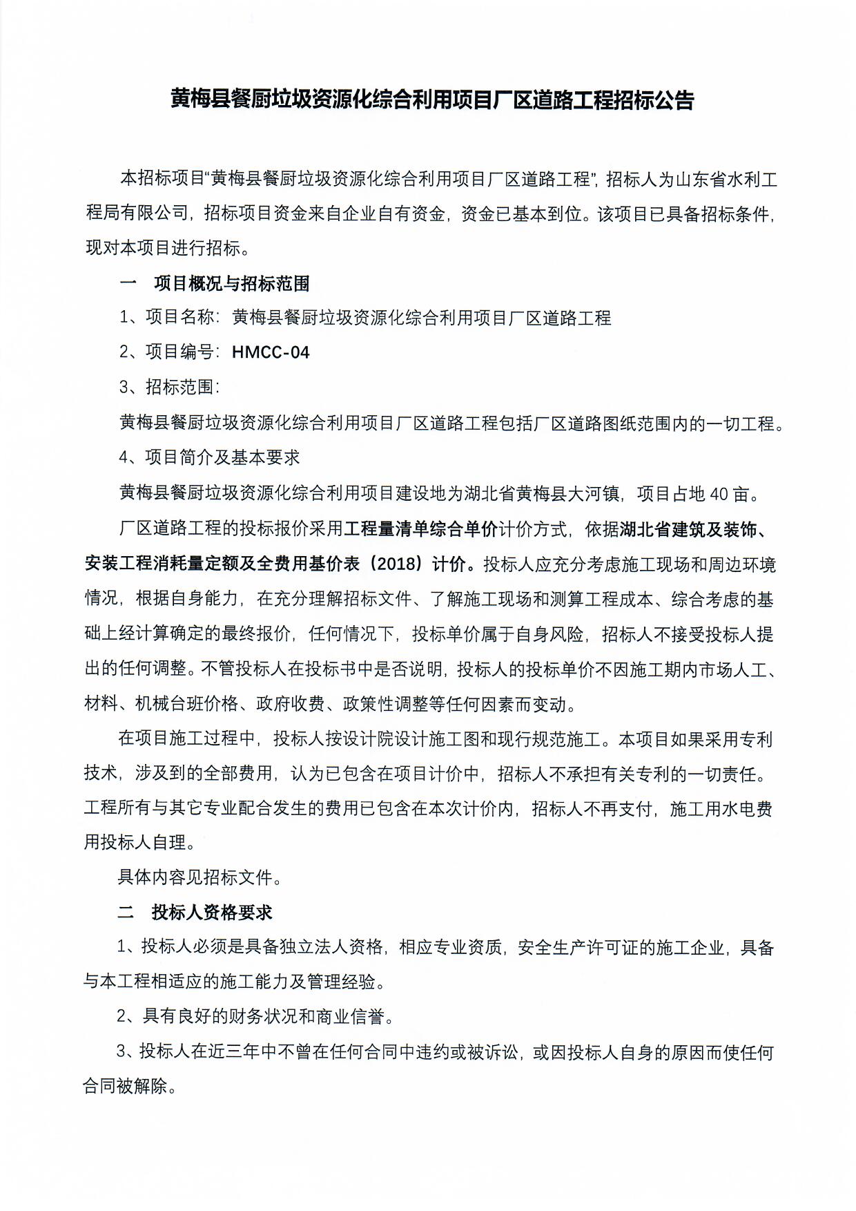 黃梅縣餐廚垃圾資源化綜合利用項(xiàng)目廠區(qū)道路工程招標(biāo)公告