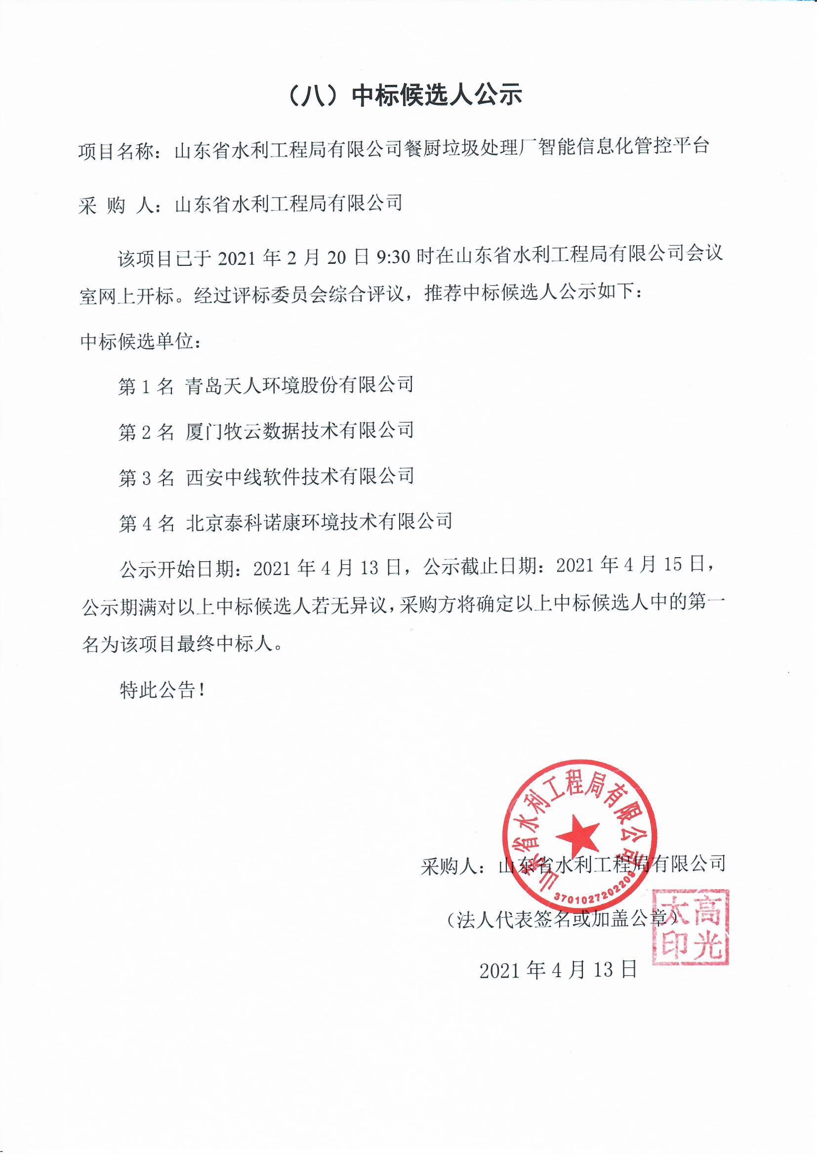 山東省水利工程局有限公司餐廚垃圾處理廠(chǎng)智能信息化管控平臺(tái)中標(biāo)候選人公示