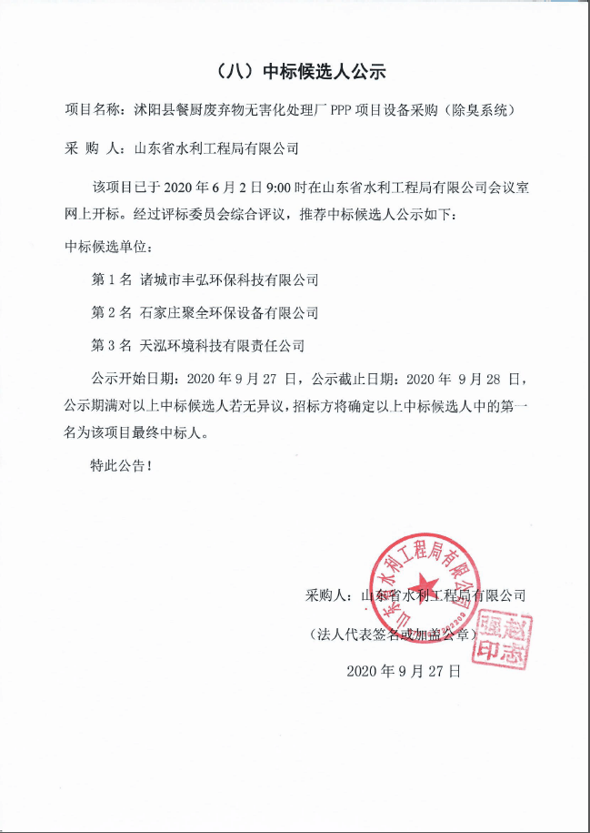 沭陽(yáng)縣餐廚廢棄物無害化處理廠PPP項(xiàng)目設(shè)備采購(gòu)(除臭系統(tǒng))中標(biāo)候選人公示