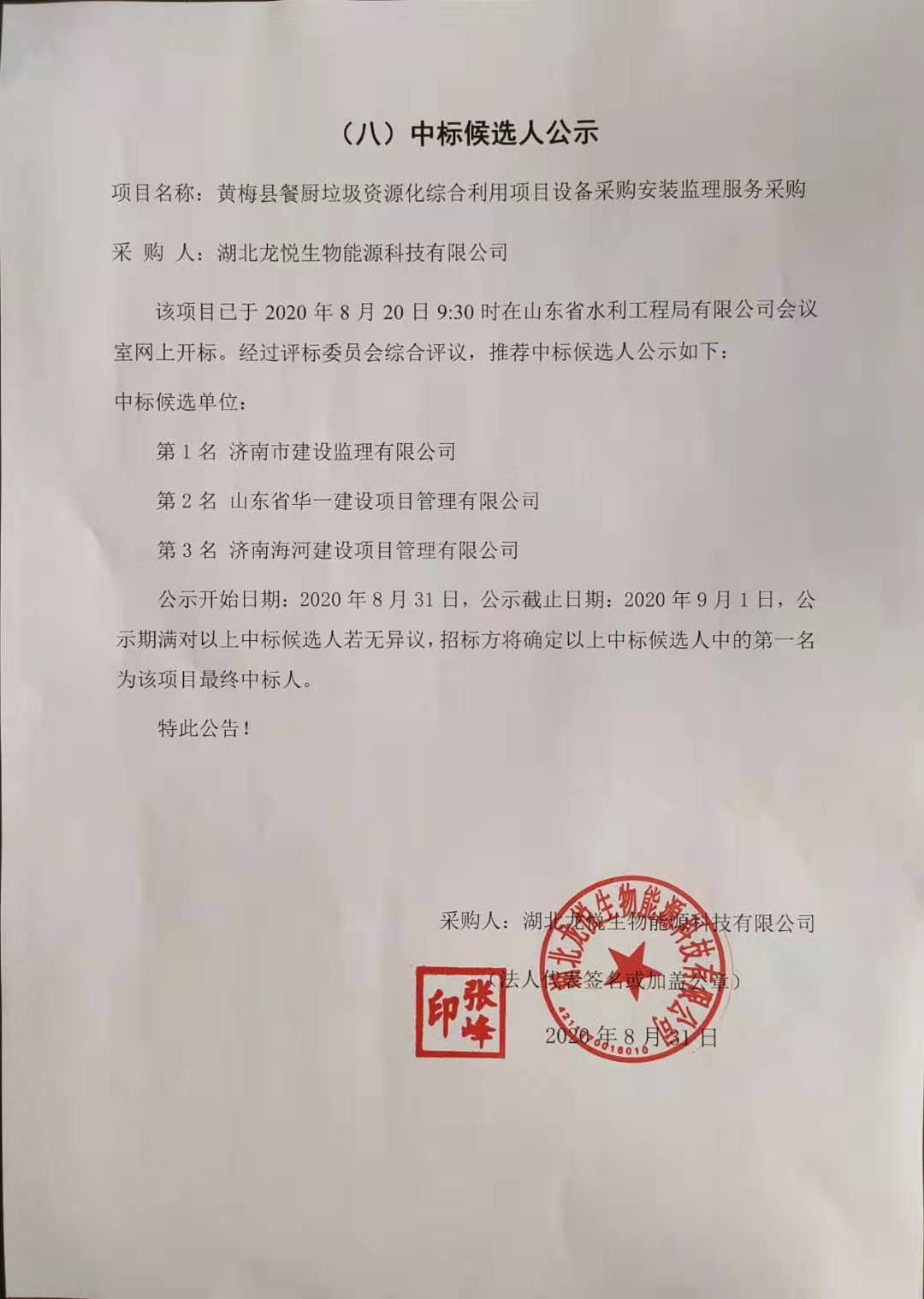 黃梅縣餐廚垃圾資源化綜合利用項(xiàng)目設(shè)備采購(gòu)安裝監(jiān)理服務(wù)采購(gòu)中標(biāo)候選人公示