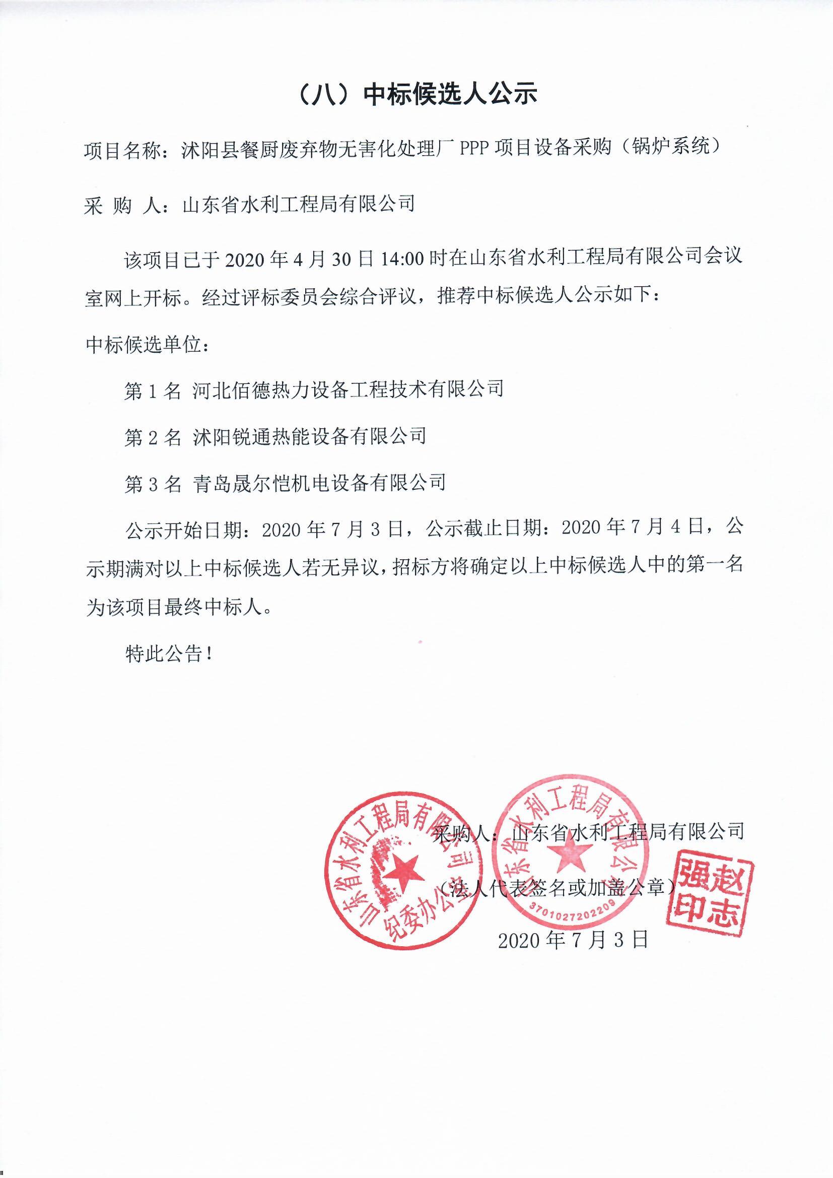 沭陽縣餐廚廢棄物無害化處理廠PPP項目設(shè)備采購(鍋爐系統(tǒng))中標(biāo)候選人公示
