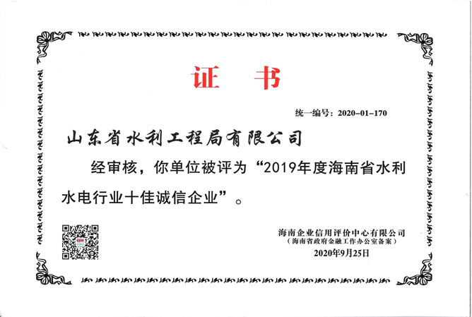 近日我公司再次獲得由海南省企業(yè)信用評價(jià)中心頒發(fā)的“2019年度海南省水利水電十佳誠信企業(yè)”和“信用等級AAA企業(yè)”兩項(xiàng)殊榮。 海南分公司自成立至今,已在海南省各地承接多項(xiàng)工程,憑借科學(xué)高效的管理理念,先進(jìn)的施 ...